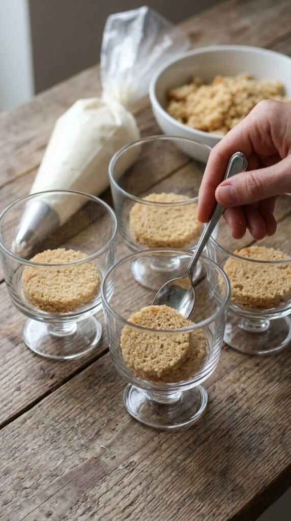 Now comes the fun part—layering! Take your prepared dessert cups and start by placing a layer of crumbled cake at the bottom. Gently press it down so it forms a solid base.