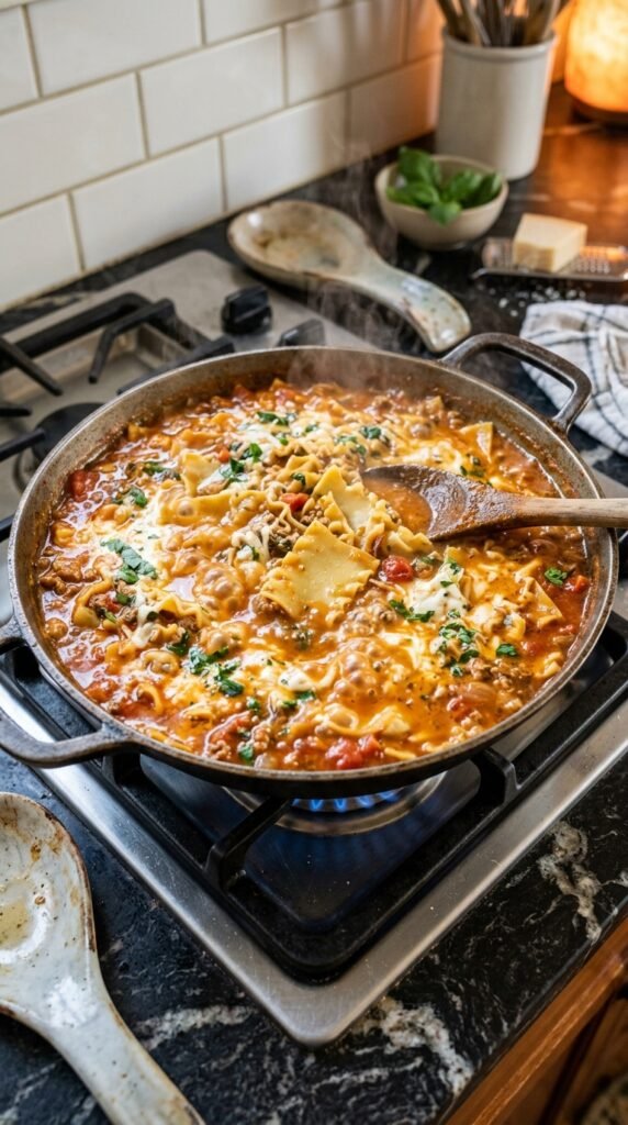 This version sticks close to what you already love. It uses simple pantry ingredients. Think tomato base, pasta, ground meat, and cheese.